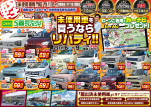 こんにちはリバティ広報部(仮)です! 11/6~11/9まで即納セール実施します。 目玉車59.9万円から販売中です …